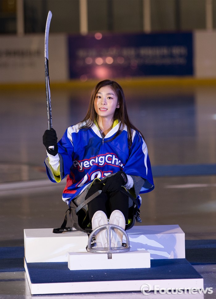 (춘천=포커스뉴스) 9일 오후 강원 춘천의암빙상장에서 제2회 2018 평창 패럴림픽 데이에 참석한 평창동계올림픽 홍보대사 김연아가 패럴림픽 성공을 기원하며 아이스슬레지하키 시타를 하고 있다.