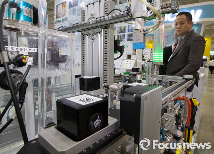 (서울=포커스뉴스) 9일 오후 서울 강남구 코엑스에서 열린 '오토메이션 월드 2016’ 만희기전 부스에서 관람객이 축소된 자동화 라인을 살펴보고 있다.