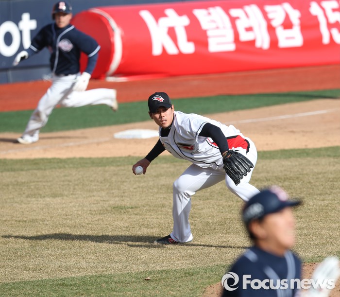 (수원=포커스뉴스) 9일 수원 kt위즈파크에서 열린 2016 KBO리그 시범경기 두산-kt 경기에서 9회초 2사2루에서 두산 이우성의 투수앞 땅볼을 kt 투수 김재윤이 잡아 1루로 송구하고 있다. 송구 실책으로 이우성은 1루에서 세이프되고 3루주자 국해성은 홈인.