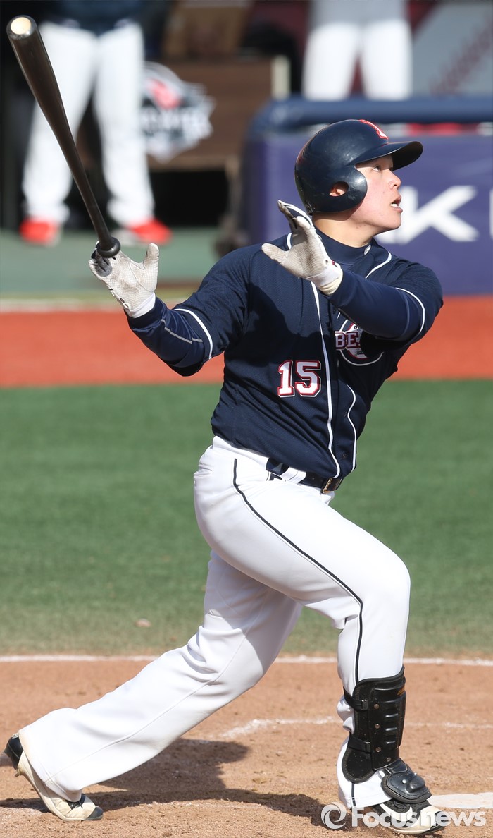 (수원=포커스뉴스) 9일 수원 kt위즈파크에서 열린 2016 KBO리그 시범경기 두산-kt 경기에서 9회초 1사 2루에서 두산 국해성이 우중간 2루타를 날리고 있다.