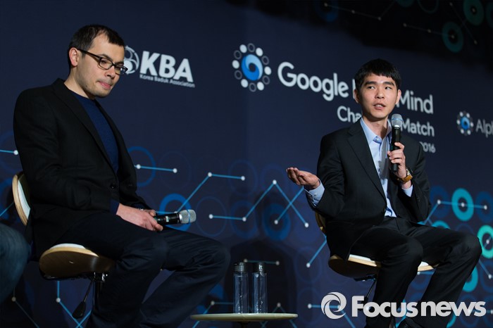 (서울=포커스뉴스) 바둑기사 이세돌(오른쪽) 9단과 데미스 하사비스 구글 딥마인드 최고경영자가 9일 오후 서울 중구 포시즌스호텔에서 구글 딥마인드 챌린지 매치, 인공지능 바둑프로그램 알파고와의 첫번째 대국 후 기자회견을 하고 있다.