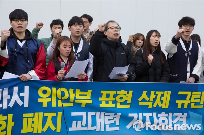 (서울=포커스뉴스) 9일 오후 서울 종로구 옛 일본대사관 앞에서 '초등학교 사회교과서 위안부 표현 삭제 규탄 기자회견'에 참가한 전국교육대학생연합 회원들이 역사교과서 국정화 폐지를 촉구하는 구호를 외치고 있다.