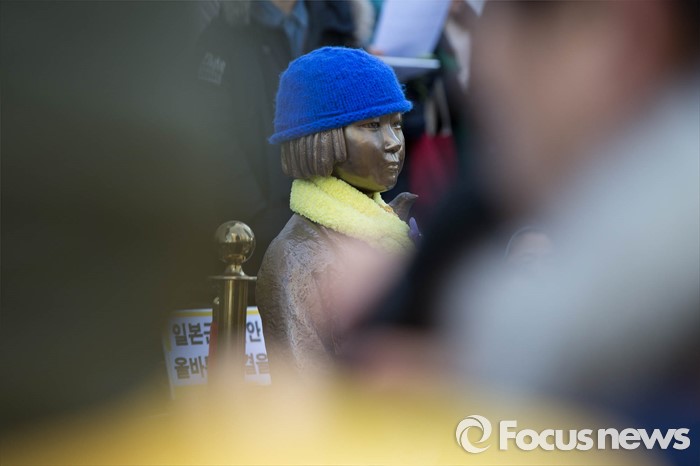 (서울=포커스뉴스) 9일 오후 서울 종로구 옛 일본대사관 앞에서 열린 '일본군 위안부 문제해결을 위한 1221차 정기 수요집회'에서 참가자들 사이로 소녀상이 보이고 있다.