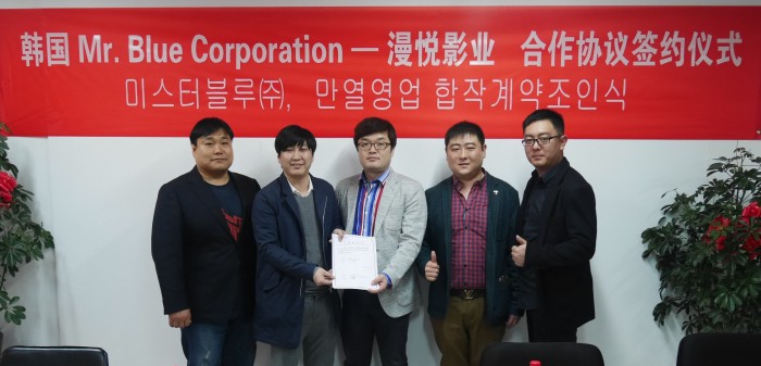 이와 함께 두 회사는 연말까지 웹드라마 기획·제작에 착수해 중국지역(홍콩, 마카오, 대만 지역 제외) 공략에 나설 계획이다.미스터블루 웹툰팀 박종길 팀장(사진 가운데)과 중국 만열영업(북경)유한공사 대표 玄浩辰 (쉬앤하오천, 사진 왼쪽 두번째)이 중국 북경의 만열영업 본사에서 웹드라마 합작관련 MOU를 체결하고 기념 사진을 위해 포즈를 취하고 있다.