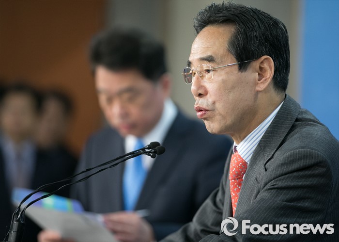 (서울=포커스뉴스) 홍창선(오른쪽) 더불어민주당 공천관리위원장과 김성수 대변인이 10일 오전 서울 여의도 국회 정론관에서 20대 총선 경선 및 단수지역과 2차 공천배제(컷오프) 명단을 발표하고 있다.