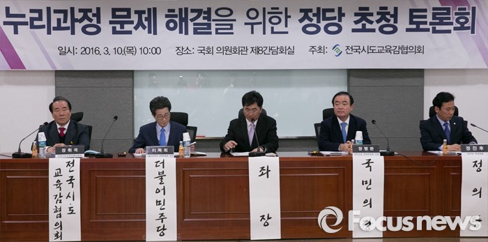 (서울=포커스뉴스) 10일 오전 서울 여의도 국회 의원회관에서 누리과정 문제해결을 위한 정당 초청 토론회에 앞서 참석자들이 자리하고 있다. 왼쪽부터 장휘국 전국시도교육감협의회장, 이목희 더불어민주당 정책위의장, 성기선 한국교육사회학회 부회장, 장병완 국민의당 정책위의장, 정진후 정의당 원내대표.