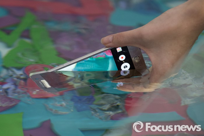 (서울=포커스뉴스) 10일 오전 서울 중구 신라호텔에서 열린 삼성전자의 스마트폰 갤럭시 S7 엣지의 방수 성능을 모델이 시연하고 있다.