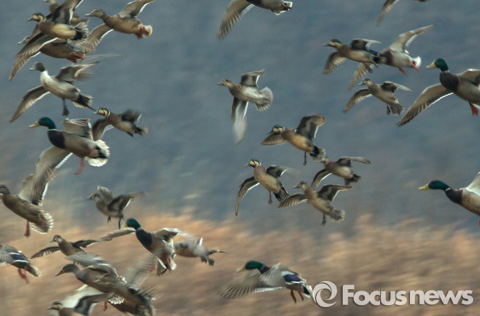 (철원=포커스뉴스) 겨울철새 가창오리(가운데, 태극머리모양은 수컷)가 청둥오리 무리사이에 섞여서 10일 오전 강원 철원군 한탄강에서 북상채비를 하고 있다.
