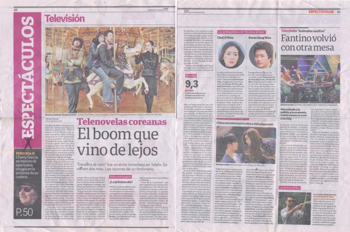 이와 함께 한류 팬의 인터뷰를 통해 "주위 친구들에게 한국하면 가장 먼저 떠오르는 게 무엇인지 물었을 때 대개 '중국' 혹은 '쭉 찢어진 눈'이라고 대답하던 것이 불과 얼마 전이다. 하지만 지금은 완전히 달라졌다. 온 세상이 한국 드라마를, 음악을, 춤을, 심지어 한국어까지 안다"는 내용을 보도했다.아르헨티나 최대일간지 클라린(Clarin)지는 3월9일자 신문에 '한국드라마-지구 건너편에서 도착한 붐'이라는 제목으로 2면에 걸쳐 한국드라마 기획기사를 보도했다.<사진제공=주아르헨티나문화원>
