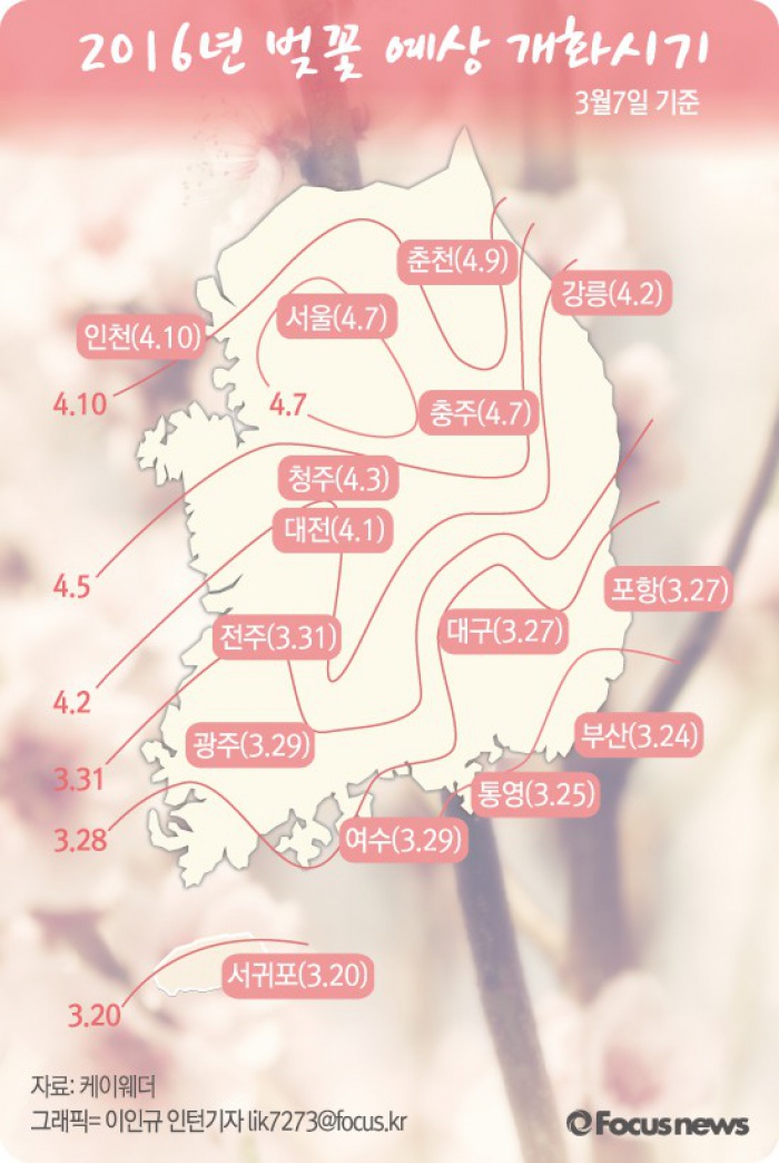 벚꽃이 절정에 이르는 4월에는 경남 진해에서 열리는 '진해군향제'를 시작으로 전국 각지에서 다양한 벚꽃축제가 진행될 예정이다.(서울=포커스뉴스) 민간기상기업 케이웨더는 벚꽃 개화시기는 지역에 따라 다소 차이가 있겠지만 평년보다 3~5일 빠를 것으로 예보했다. 2016.03.09 이인규 인턴기자