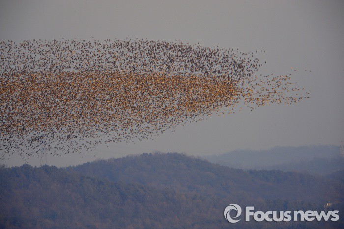 (예산=포커스뉴스) 한국의 대표적 겨울철새 가창오리 무리가 충남 예산군 삽교호에 몰려들고 있다. 러시아 바이칼 호수 주변이 고향인 이들은 한반도 남녘에서 월동하다가 북상길에는 반드시 삽교호를 거쳐 간다.