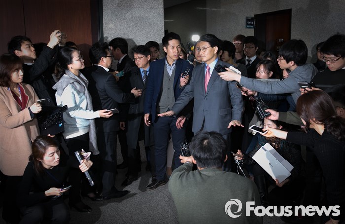 (서울=포커스뉴스) '김무성 욕설 녹취록'으로 논란을 일으킨 윤상현 새누리당 의원이 10일 오전 서울 여의도 국회에서 비공개 최고위원회의에 참석한 뒤 취재진 질문에 답하고 있다. 전날 김무성 대표와의 면담이 불발된 윤 의원은 이날 오전 김 대표의 자택을 방문해 사과했다고 전했다.