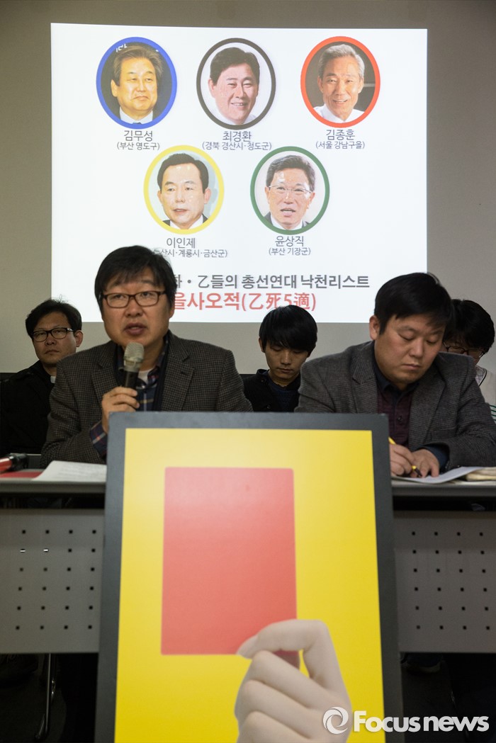 (서울=포커스뉴스) 10일 오전 서울 종로구 참여연대에서 을(乙)총선연대, 참여연대를 비롯한 시민단체 회원들이 '경제민주화 을(乙)들의 총선연대 집중 낙천리스트 발표 기자회견'을 하고 있다.
