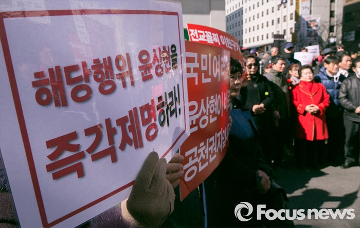 (서울=포커스뉴스) 10일 오후 서울 여의도 새누리당사 앞에서 부산에서 상경한 김무성 대표 지지자들이 윤상현 의원 징계 등을 촉구하는 집회를 하고 있다.