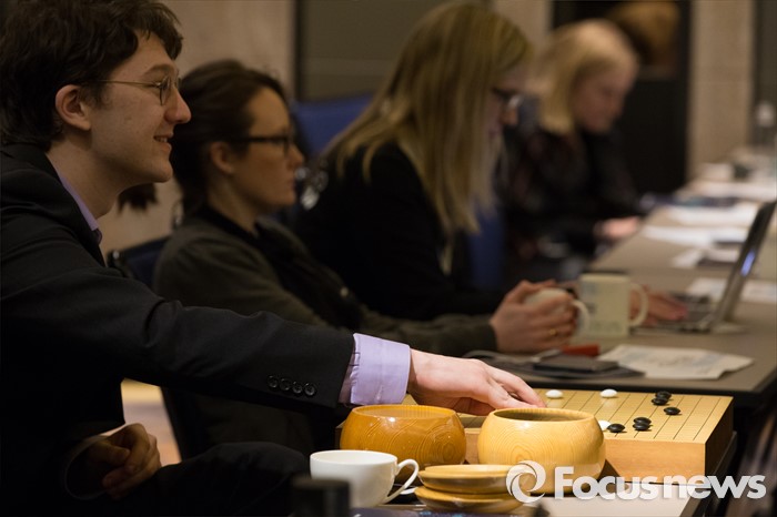 (서울=포커스뉴스) 10일 오후 서울 종로구 포시즌스호텔 기자실에서 한 외신 기자가 이세돌 9단과 구글 인공지능 알파고의 '구글 딥마인드 챌린지 매치' 2차 대국을 보며 직접 바둑을 두고 있다.