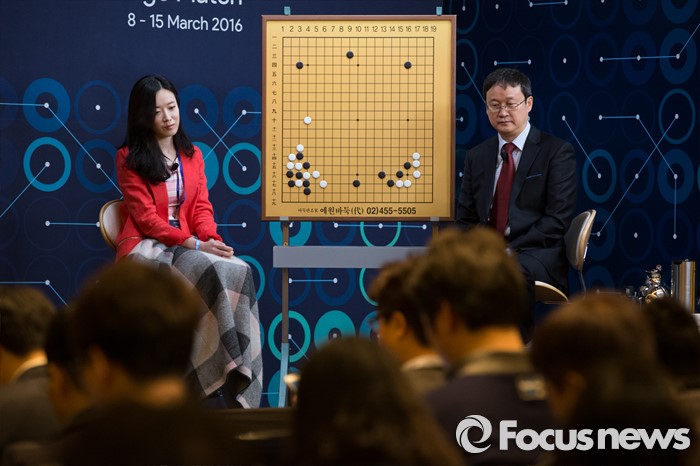 (서울=포커스뉴스) 10일 오후 서울 종로구 포시즌스호텔 기자실에서 유창혁(오른쪽) 프로9단 해설진이 이세돌 9단과 구글 인공지능 알파고의 '구글 딥마인드 챌린지 매치' 2차 대국을 해설하고 있다.