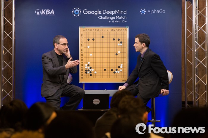 (서울=포커스뉴스) 10일 오후 서울 종로구 포시즌스호텔 기자실에서 마이클 레드먼드(오른쪽)와 크리스 갈록 외국 해설진이 이세돌 9단과 구글 인공지능 알파고의 '구글 딥마인드 챌린지 매치' 2차 대국을 해설하고 있다.