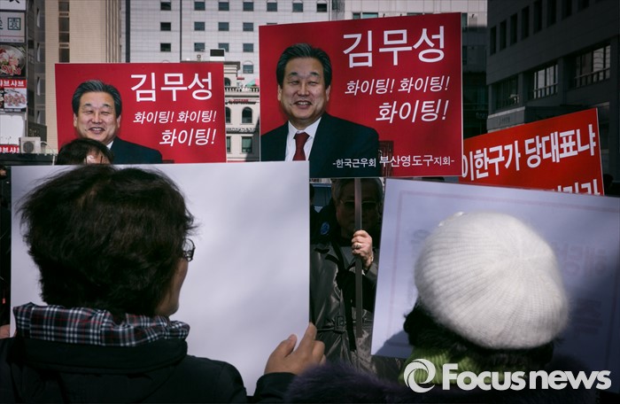 (서울=포커스뉴스) 10일 오후 서울 여의도 새누리당사 앞에서 부산에서 상경한 김무성 대표 지지자들이 윤상현 의원 징계 등을 촉구하는 집회를 하고 있다.
