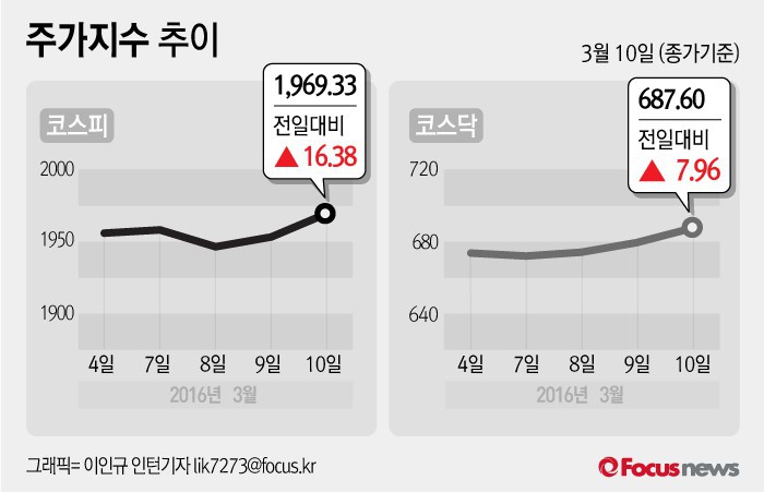 (서울=포커스뉴스) 10일 코스피지수는 전날 보다 0.84%(16.38포인트) 오른 1969.33에 장을 마쳤다. 코스닥지수는 전일 대비 1.17%(7.96포인트) 오른 687.60에 마감했다.