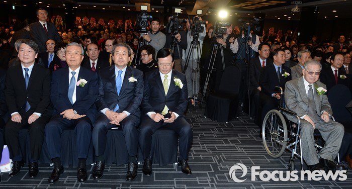 (서울=포커스뉴스) 김종필 전 국무총리가 10일 오후 서울 종로구 세종문화회관 세종홀에서 열린 자신의 정치인생을 담은 '김종필 증언록' 출판기념회에 참석해 정당 대표들과 함께 자리하고 있다. 왼쪽부터 안철수 국민의당 상임공동대표, 김종인 더불어민주당 비대위 대표, 김무성 새누리당 대표, 정의화 국회의장, 김 전 총리.