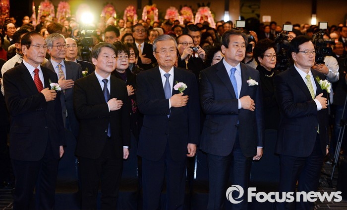 (서울=포커스뉴스) 10일 오후 서울 종로구 세종문화회관 세종홀에서 열린 김종필 전 국무총리의 정치인생을 담은 '김종필 증언록' 출판기념회에 참석한 내빈들이 국기에 대한 경례를 하고 있다. 앞줄 오른쪽부터 정의화 국회의장, 김무성 새누리당 대표, 김종인 더불어민주당 비대위 대표, 안철수 국민의당 상임공동대표, 신경식 대한민국헌정회장.
