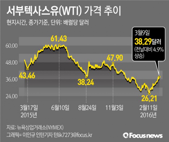 (서울=포커스뉴스) 9일(현지시각) 뉴욕상업거래소(NYMEX)에서 서부텍사스산원유(WTI) 가격은 전날보다 배럴당 1.79달러(4.9%) 급등한 38.29달러에 거래를 마쳤다.