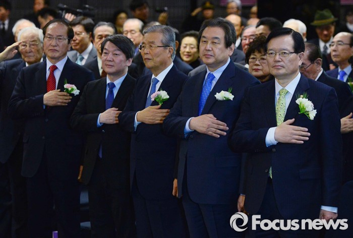 (서울=포커스뉴스) 정의화(앞줄 오른쪽부터) 국회의장, 김무성 새누리당 대표, 김종인 더불어민주당 비대위 대표, 안철수 국민의당 상임공동대표, 신경식 대한민국헌정회장 등 참석자들이 10일 오후 서울 종로구 세종문화회관 세종홀에서 열린 김종필 전 국무총리의 정치인생을 담은 '김종필 증언록' 출판기념회에 참석해 국기에 대한 경례를 하고 있다.