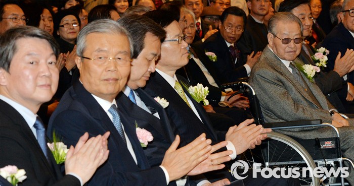 (서울=포커스뉴스) 김종필 전 국무총리가 10일 오후 서울 종로구 세종문화회관 세종홀에서 열린 자신의 정치인생을 담은 '김종필 증언록' 출판기념회에 참석해 정당 대표들들을 바라보고 있다. 왼쪽부터 안철수 국민의당 상임공동대표, 김종인 더불어민주당 비대위 대표, 김무성 새누리당 대표, 정의화 국회의장, 김 전 총리.