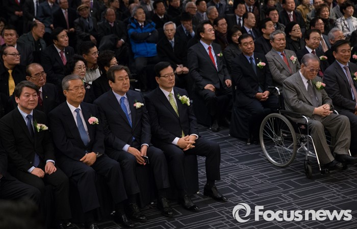 (서울=포커스뉴스) 김종필 전 국무총리가 10일 오후 서울 종로구 세종문화회관 세종홀에서 열린 자신의 정치인생을 담은 '김종필 증언록' 출판기념회에 참석해 정당 대표들과 함께 자리하고 있다. 왼쪽부터 안철수 국민의당 상임공동대표, 김종인 더불어민주당 비대위 대표, 김무성 새누리당 대표, 정의화 국회의장, 김 전 총리.