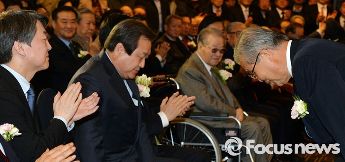 (서울=포커스뉴스) 김종인 더불어민주당 비대위 대표가 10일 오후 서울 종로구 세종문화회관 세종홀에서 열린 김종필 전 국무총리의 정치인생을 담은 '김종필 증언록' 출판기념회에 참석해 인사하고 있다. 왼쪽부터 안철수 국민의당 상임공동대표, 김무성 새누리당 대표, 김 전 총리, 김 대표.