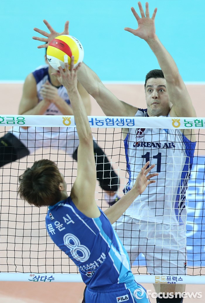 이는 대한항공 역시 마찬가지다. 서브 리시브가 흔들리면 다양한 레프트 자원들을 제대로 활용할 수 없다. 상대적으로 강세인 레프트를 제대로 활용하지 못하면 역시 모로즈에게 공격이 집중되고 이 경우 외국인선수간 파괴력에서 밀리는 대한항공은 고전할 수밖에 없다.(인천=포커스뉴스) 지난 1월3일 인천 계양체육관에서 열린 '2015-2016NH농협 V-리그' 남자부 대한항공-삼성화재 경기에서 대한항공 모로즈가 삼성화재 류윤식의 공격에 블로킹을 대고 있다. 2016.01.03 우정식 기자