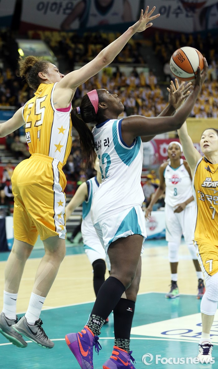 (부천=포커스뉴스) 10일 부천체육관에서 열린 2015-2016 여자프로농구 PO 1차전 KEB하나-KB스타즈 경기에서 KEB하나 첼시 리가 KB스타즈 햄비의 블록을 피해 리버스 레이업슛을 시도히고 있다.