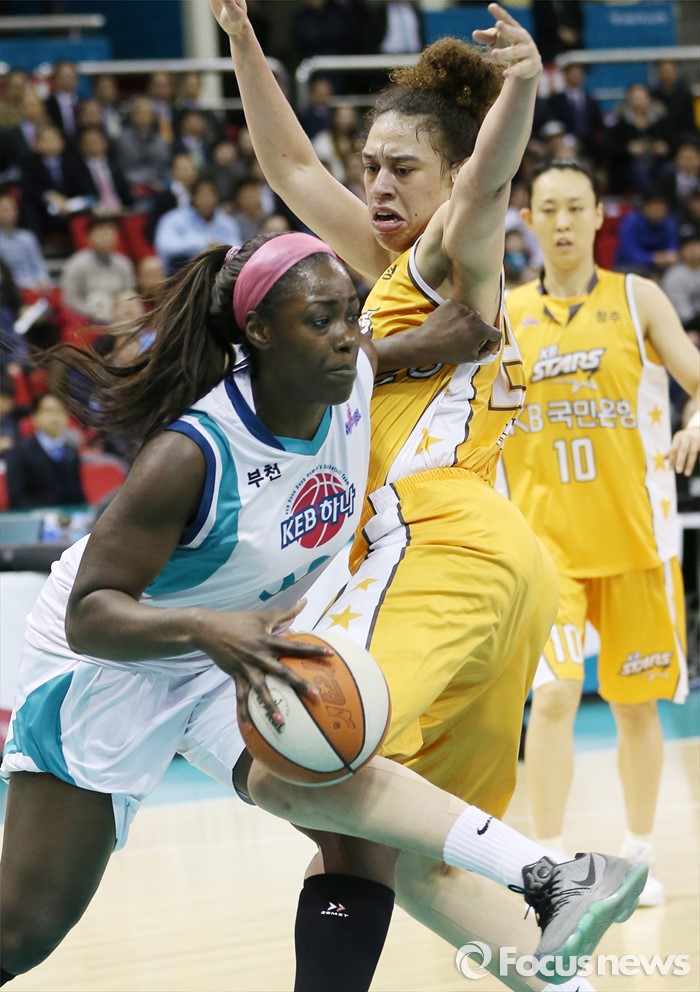 (부천=포커스뉴스) 10일 부천체육관에서 열린 2015-2016 여자프로농구 PO 1차전 KEB하나-KB스타즈 경기에서 KEB하나 첼시 리가 KB스타즈 햄비를 밀어내며 골밑으로 대시하고 있다.