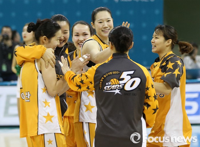 (부천=포커스뉴스) 10일 부천체육관에서 열린 2015-2016 여자프로농구 PO 1차전 KEB하나-KB스타즈 경기에서 KEB하나를 물리친 KB스타즈 선수들이 코트에 모여 승리의 기쁨을 나누고 있다.
