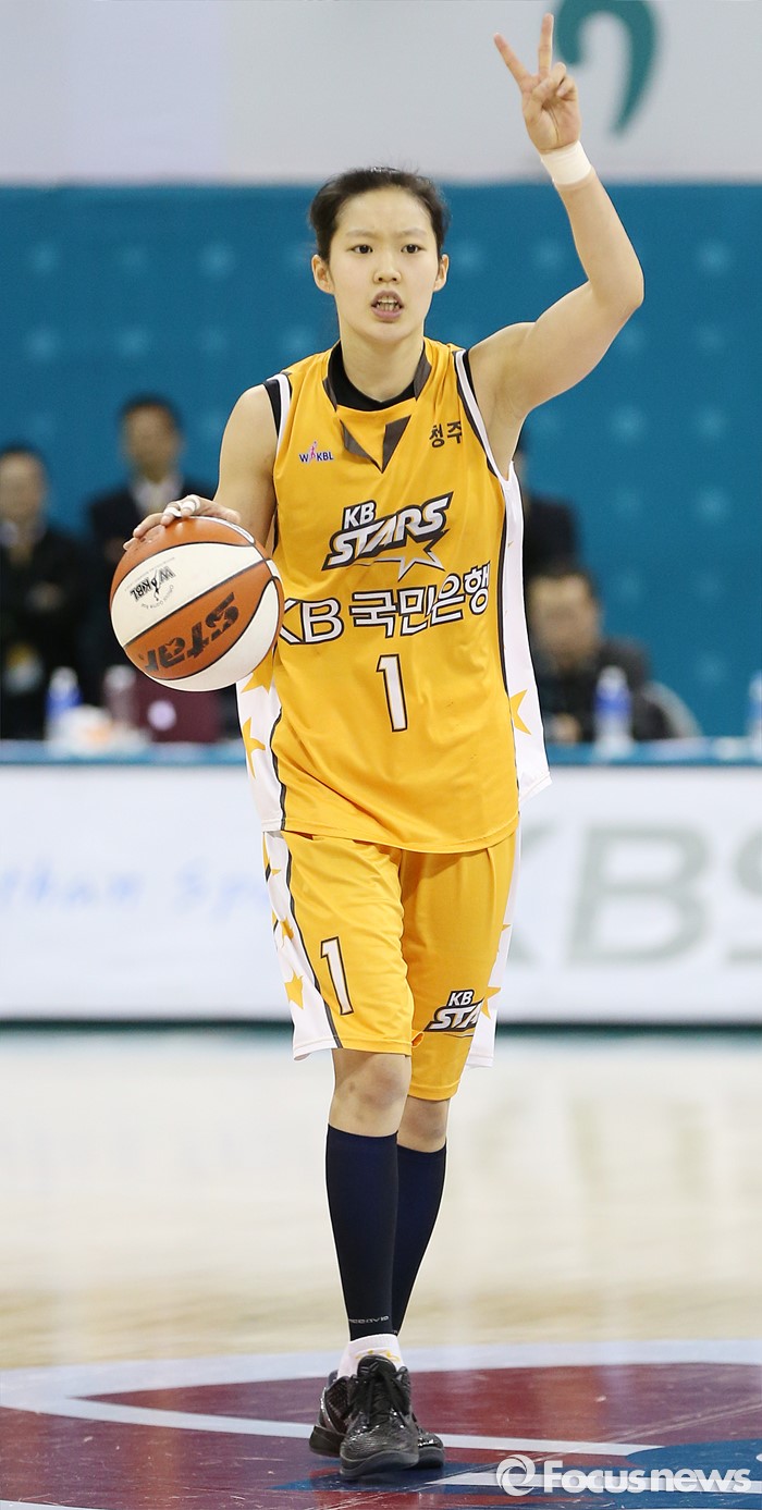 (부천=포커스뉴스) 10일 부천체육관에서 열린 2015-2016 여자프로농구 PO 1차전 KEB하나-KB스타즈 경기에서 KB스타즈 가드 홍아란이 2번 작전을 알리고 있다.