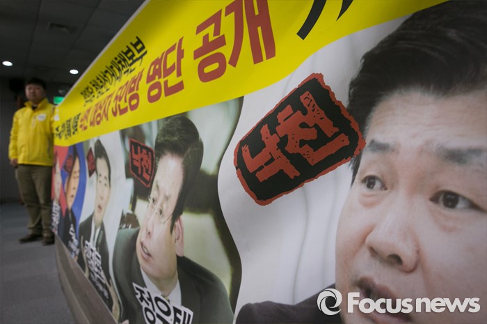 (서울=포커스뉴스) 11일 오전 서울 여의도 국회 정론관에서 정의당 청년선대본부가 금수저 취업 특혜 의혹 5인방 공천 낙마 촉구 기자회견을 하고 있다. 이날 명단에 발표된 5인방은 김무성 새누리당 대표, 최경환, 정우택, 정용기 의원, 김진표 전 더불어민주당 의원이다.