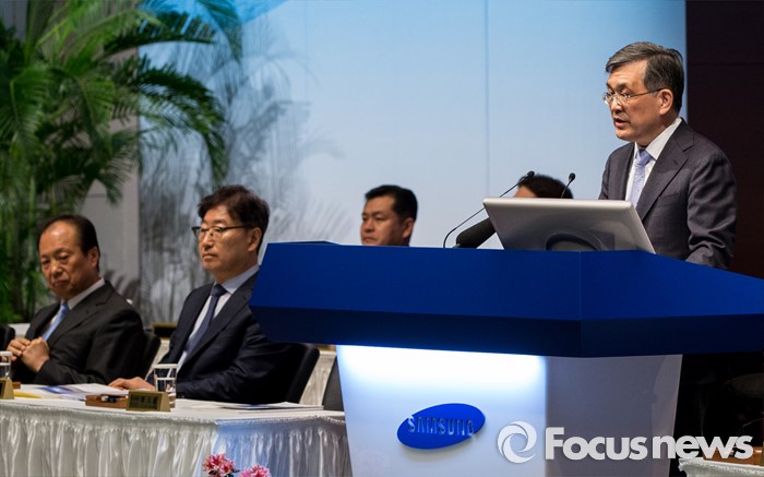 (서울=포커스뉴스) 11일 오전 서울 서초구 삼성전자 본사 다목적홀에서 열린 47기 정기주주총회에 참석한 권오현 이사회 의장(대표이사 부회장)이 인사말을 하고 있다.