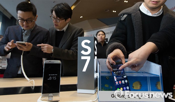 (서울=포커스뉴스) 갤럭시 S7 공식 출시일인 11일 오전 서울 종로구 광화문 KT스퀘어에서 관계자들이 S7을 선보이고 있다.