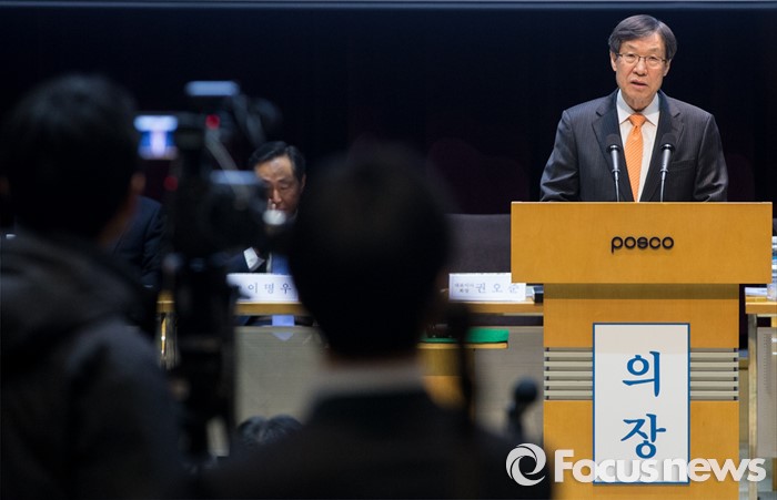 (서울=포커스뉴스) 11일 오전 서울 강남구 포스코센터에서 열린 정기주주총회에 참석한 권오준 포스코 회장이 인사말을 하고 있다.