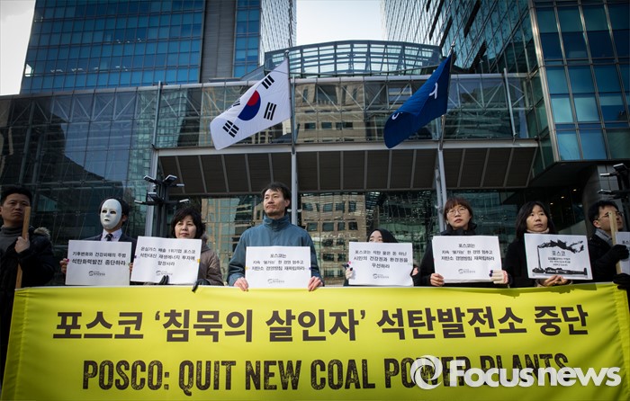 (서울=포커스뉴스) 11일 오전 서울 강남구 포스코센터 앞에서 환경운동연합 회원들이 포스코의 석탄화력발전소 추진을 규탄하는 기자회견을 갖고 있다.