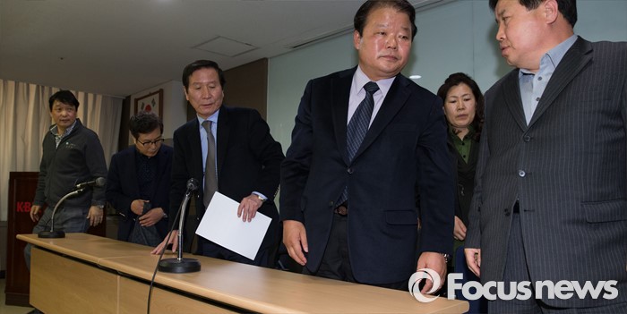 (서울=포커스뉴스) 11일 오전 서울 영등포구 중소기업중앙회 중회의실에서 정기섭 회장을 비롯한 임원들이 북한당국의 개성공단 자산 청산통보에 대한 입주기업의 입장발표를 마치고 나서고 있다.