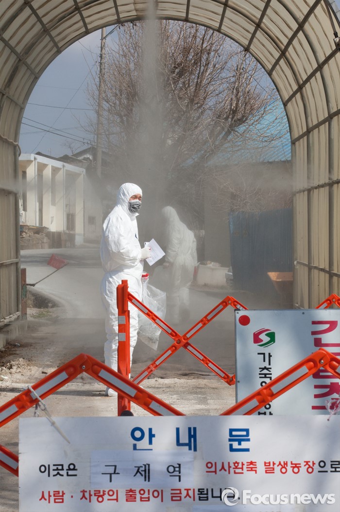 (논산=포커스뉴스) 지난 10일 충남 논산 광석면 소재 돼지농가에서 구제역 의심신고가 접수된 돼지가 11일 확진판정을 받은 가운데 농장이 위치한 마을 입구에서 방역 관계자들이 방역작업을 하고 있다. 해당 농가에서 사육중인 돼지 400마리는 모두 매몰 처분 됐으며, 이번 구제역 추가로 확인됨에 따라 충남지역에서만 5건의 구제역이 발생했다.