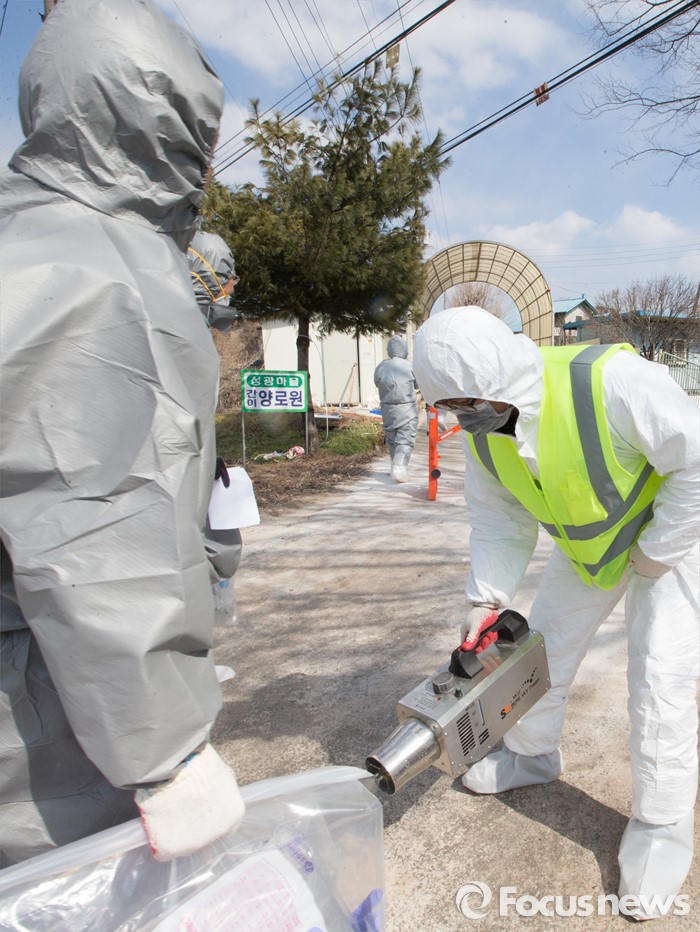 (논산=포커스뉴스) 지난 10일 충남 논산 광석면 소재 돼지농가에서 구제역 의심신고가 접수된 돼지가 11일 확진판정을 받은 가운데 농장이 위치한 마을 입구에서 방역 관계자들이 소독을 하고 있다. 해당 농가에서 사육중인 돼지 400마리는 모두 매몰 처분 됐으며, 이번 구제역 추가로 확인됨에 따라 충남지역에서만 5건의 구제역이 발생했다.