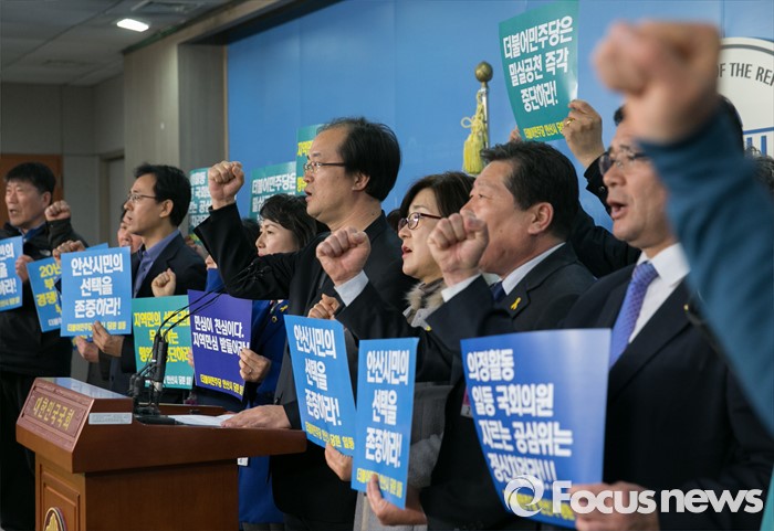 (서울=포커스뉴스) 11일 오후 서울 여의도 국회 정론관에서 더불어민주당 공천관리위원회 2차 공천배제(컷오프) 명단에 포함된 부좌현 의원의 지역구 당원들이 발표 철회를 촉구하는 기자회견을 하고 있다.