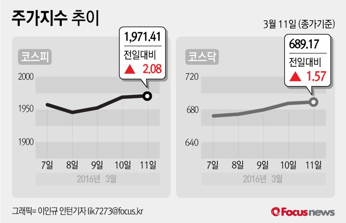 (서울=포커스뉴스) 11일 코스피지수는 전날 보다 0.11%(2.08포인트) 오른 1971.41에 장을 마쳤다. 코스닥지수는 전일 대비 0.23%(1.57포인트) 오른 689.17에 마감했다.