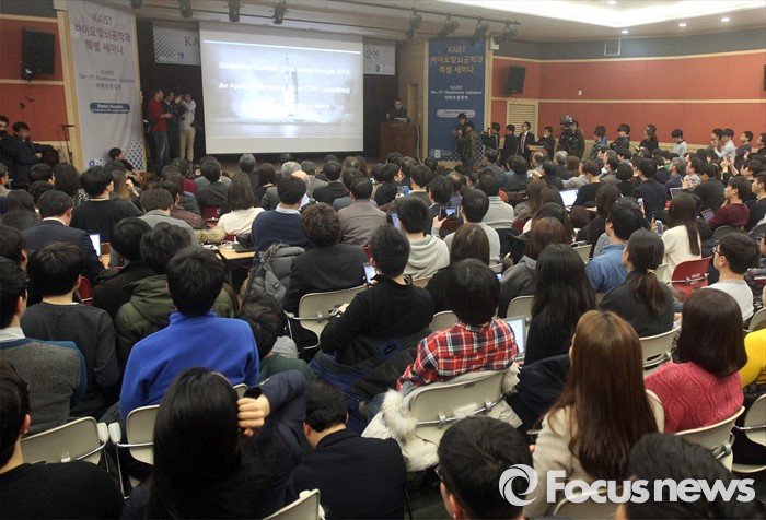 (대전=포커스뉴스) 이세돌 9단과 겨루는 인공지능 컴퓨터 알파고를 개발한 구글 딥마인드 최고경영자 데미스 하사비스가 11일 오후 대전 유성구 한국과학기술원에서 '인공지능과 미래' 라는 주제로 강연을 하고 있다.