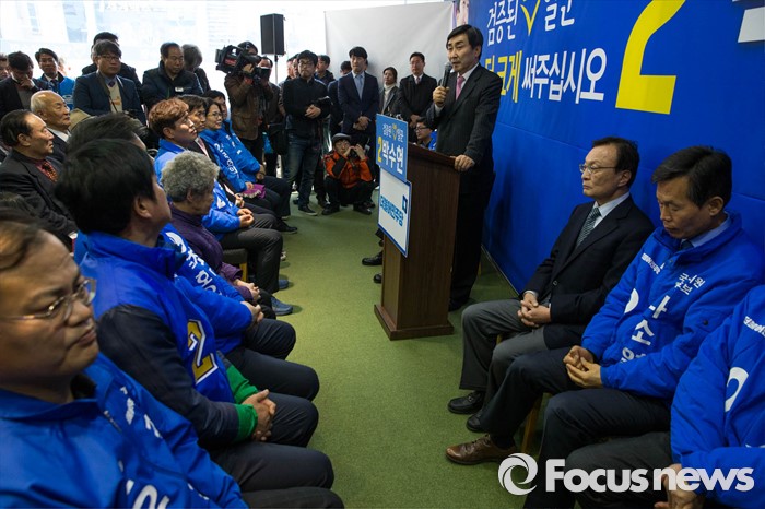 (공주=포커스뉴스) 이종걸 더민주 원내대표가 11일 오후 충남 공주시에서 열린 더민주 박수현 의원의 선거사무소 개소식에 참석, 박 의원의 지지를 호소하며 발언하고 있다.