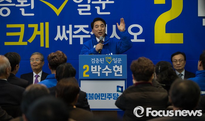 (공주=포커스뉴스) 11일 오후 충남 공주시에서 열린 더민주 박수현 의원의 선거사무소 개소식에서 박 의원이 출마선언을 하고 있다.