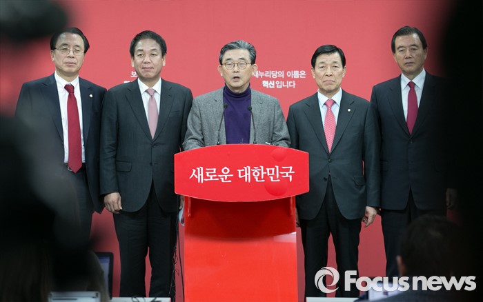 (서울=포커스뉴스) 이한구 새누리당 공천관리위원장과 위원들이 11일 오후 서울 여의도 당사에서 공관위 내부 갈등 등에 대해 사과하는 내용의 기자회견을 하고 있다. 왼쪽부터 김회선, 박종희 위원, 이 위원장, 황진하 부위원장, 홍문표 위원.