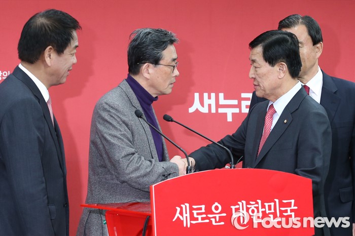(서울=포커스뉴스) 이한구 새누리당 공천관리위원장과 위원들이 11일 오후 서울 여의도 당사에서 공관위 내부 갈등 등에 대해 사과하는 내용의 기자회견을 마친 뒤 악수하고 있다. 왼쪽부터 박종희 위원, 이 위원장, 황진하 부위원장, 홍문표 위원.